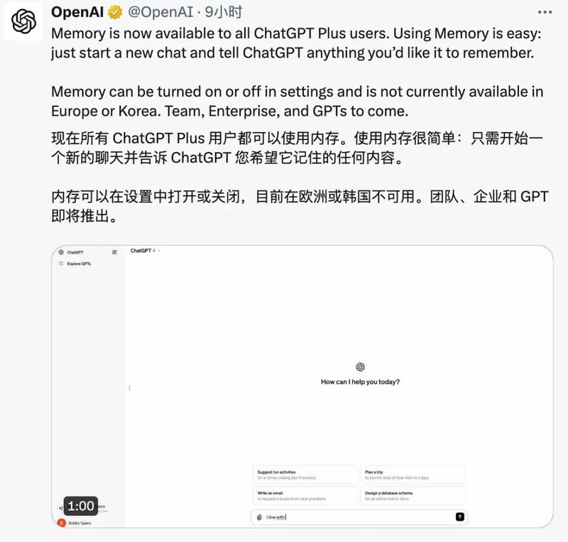 今天凌晨,OpenAI 官方宣布正在为 ChatGPT Plus 账户推出记忆功能。